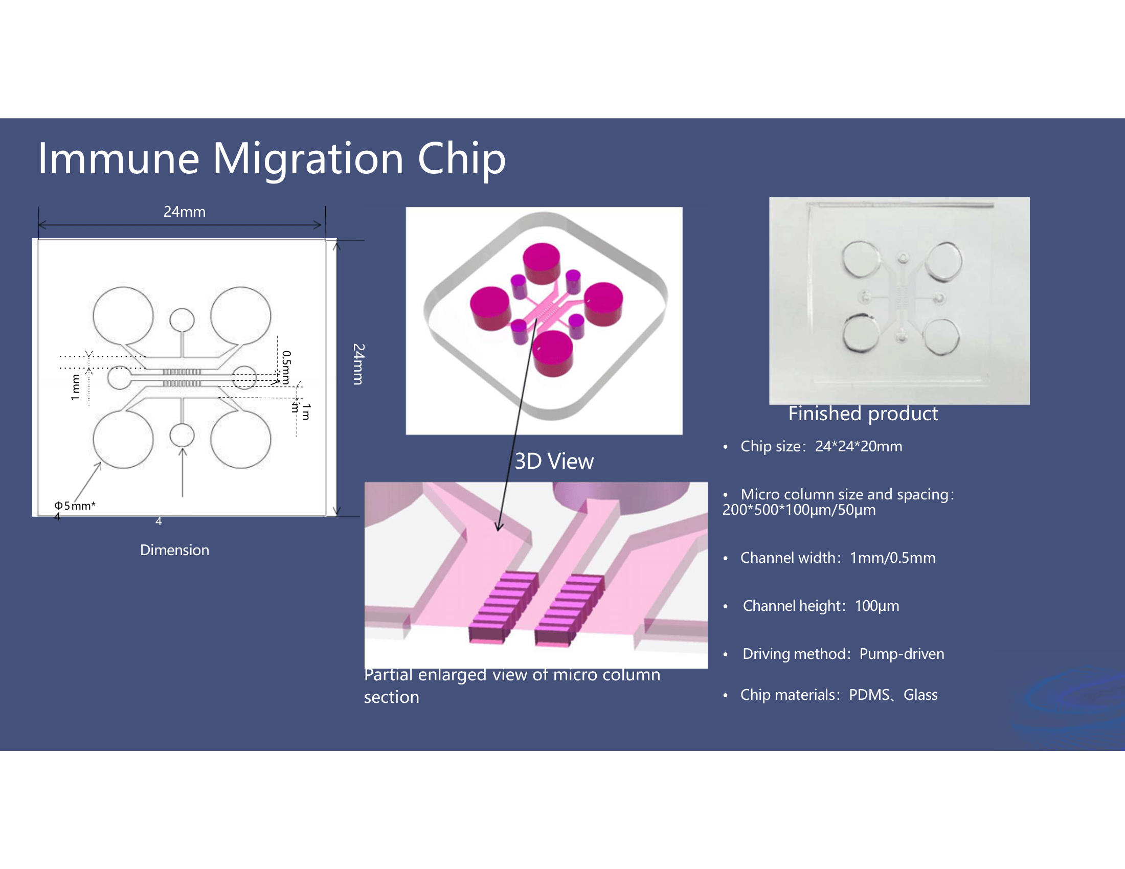 Substrate Material: The substrate material is typically made of glass, silicon, or polymer materials. The choice of material depends on the specific application and the desired properties of the chip, such as optical transparency, biocompatibility, mechanical strength, and ease of fabrication.